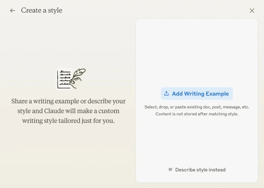 你也可以用官方预设样式,也可以自己定制风格或者上传自己的或者你喜欢写作风格文档,让Claude来学习这个风格,使用它来回答或者写作。