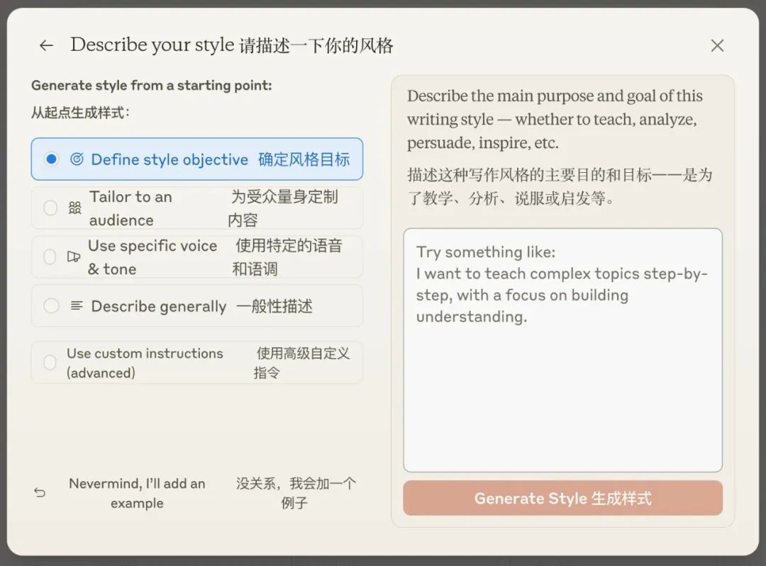 上传写作样本:上传文件或粘贴文本,Claude 会分析并生成匹配的语气和形式。描述需求:在基础样式的基础上,提供具体说明来定制回复样式。写作风格目标:描述这种写作风格的主要目的和目标——是为了教学、分析、说服或启发等。目标受众需求:描述您希望 Claude 为其撰写的目标受众的详细信息,包括相关的需求和偏好。特定语气语调:考虑正式性、情感、个性等特征,以及你希望书面回复传达的感觉。一般性描述:详细描述你希望 Claude 的写作风格,越具体越好。高级自定义指令:针对这种风格编写具体的自定义指示,而不是自动生成风格提示。克劳德会忽略不符合我们指导方针的指示。![]()