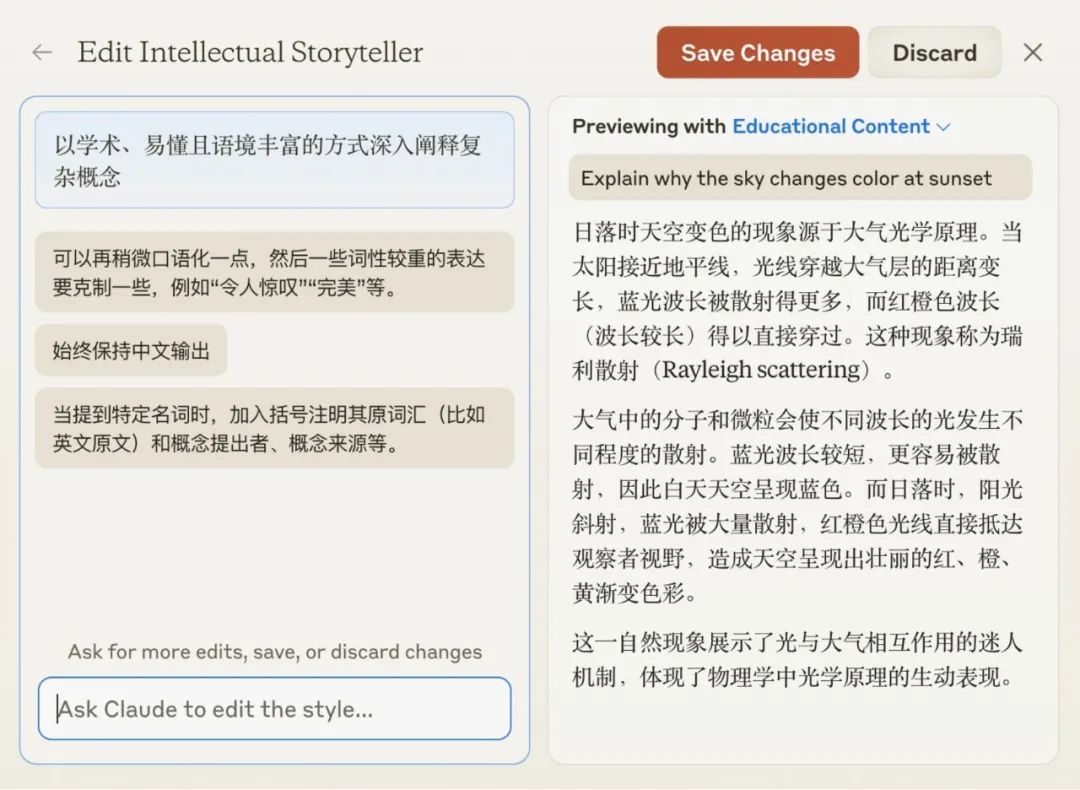 Claude 提供以下预设对话样式,用户可根据需求选择:Explanatory(解释性):教育性回复,适合学习新概念。2. 自定义样式