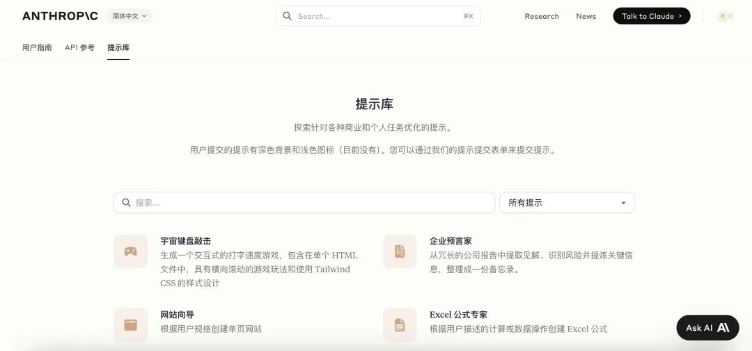 这是由Claude官方推出的一个提示词库(Prompt Library),共计64个提示词,涵盖了多种个人和商业的任务场景。重点是,这个提示词库支持中文,切换到中文模式后,你可以得到64个中文提示词,然后可以把这些提示词应用到你平时常用的AI工具中。