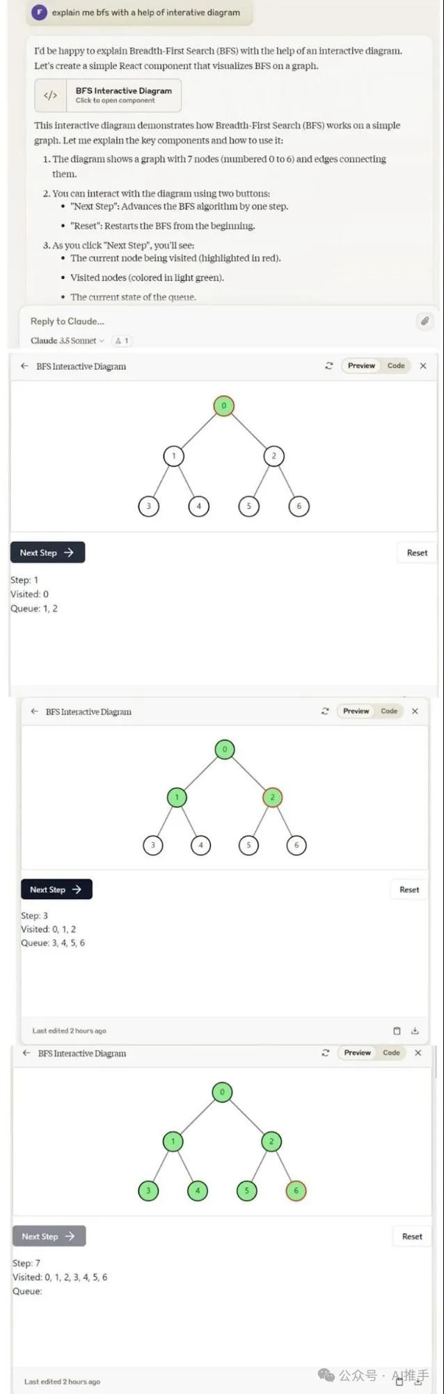 看看这个例子,Claude 3.5 Sonnet 在 Artifacts 部分用一个动画演示了广度优先搜索。看起来信息量很大!