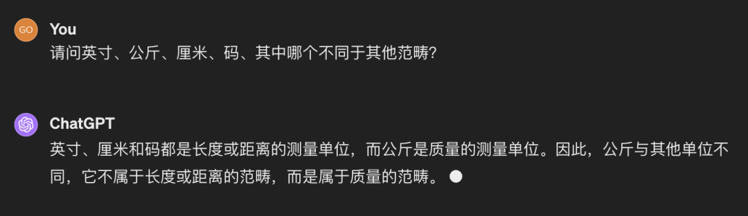 题目是,“请问英寸、公斤、厘米、码、其中哪个不同于其他范畴?”Claude 3 Opus和GPT-4都给出了正确答案,前者给出的答案解析更详细。![]()