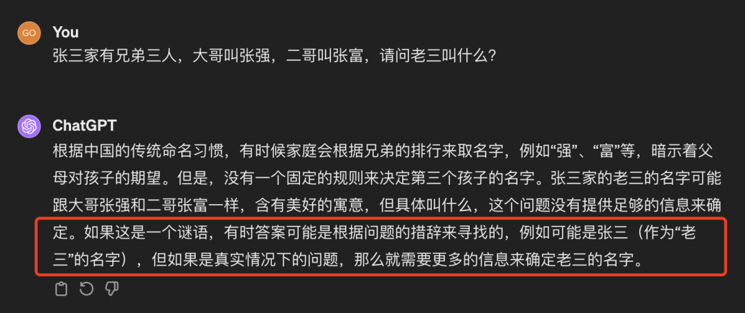 之前在做GPT-4和ChatGPT对比测试时,有一道脑筋急转弯同时难住了它们。让我们看看这次Claude 3 Opus表现如何。题目是,“张三家有兄弟三人,大哥叫张强,二哥叫张富,请问老三叫什么?”(相信很多人都会抢答了,答案就是“张三”)嗯?第一个测试就不通过,是Claude 3 Opus的逻辑推理能力没升级到位还是挑选的题目一针见血?GPT-4倒是提到了叫“张三”的可能性。![]()