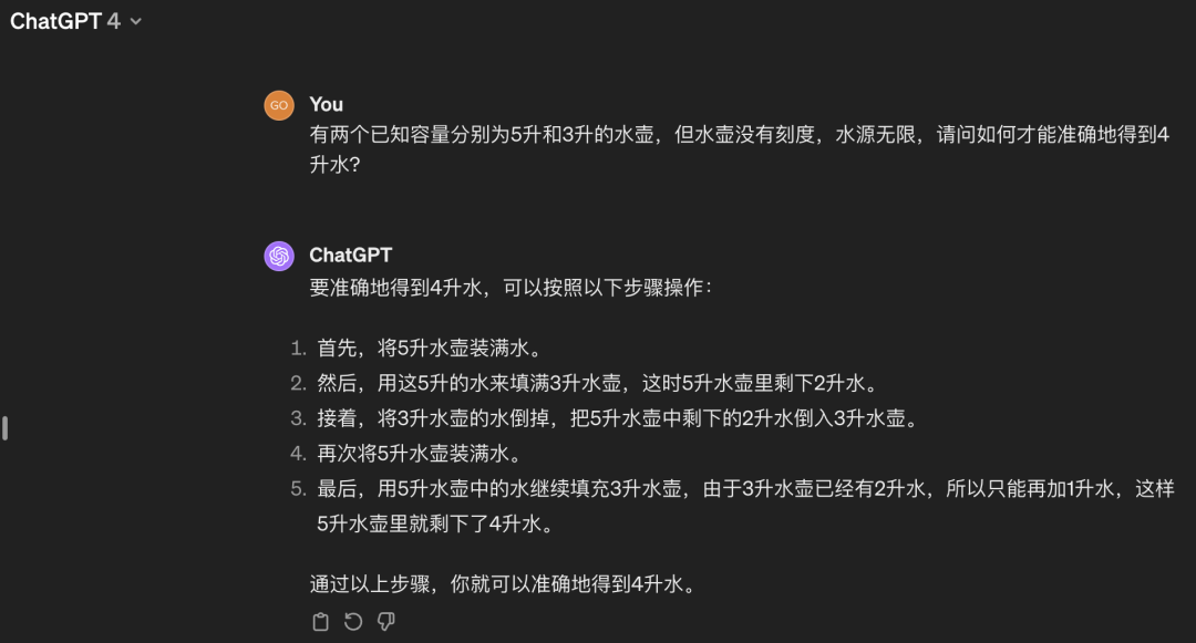 再来一道当年刷互联网大厂面试题时遇到的经典数学问题,看看这两个模型表现如何。题目是,“有两个已知容量分别为5升和3升的水壶,但水壶没有刻度,水源无限,请问如何才能准确地得到4升水?”从结果来看,两个模型都给出了正确的答案。相较而言,Claude 3 Opus的解析更全面一些,但就小编的感受来说,GPT-4的解释更简单明了。![]()
