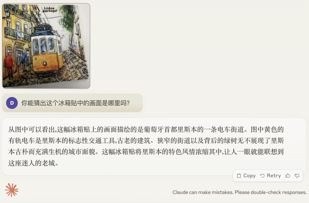 这次Claude 3终于是把视觉能力补齐了,用户可以直接放图进去进行解析。搜狐科技在体验了一段时间后,认为Claude 3在多模态信息处理方面与GPT-4相当,基本无差异。让Claude 3猜猜我桌子上的冰箱贴是描绘的哪里,这种问题对它来说不在话下。![]()
